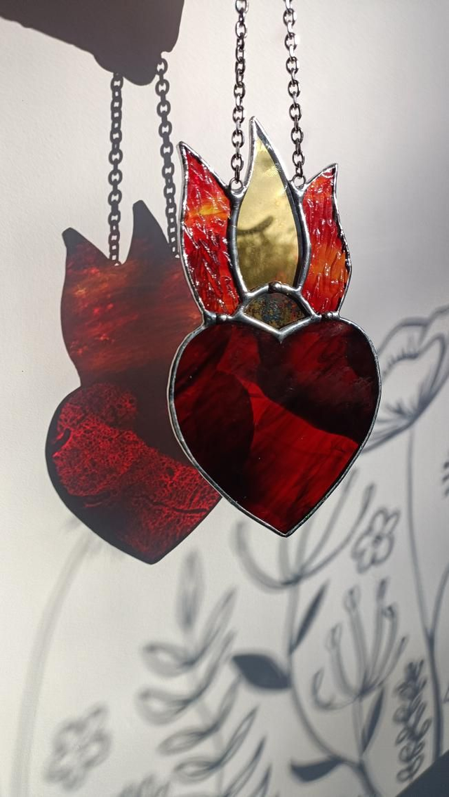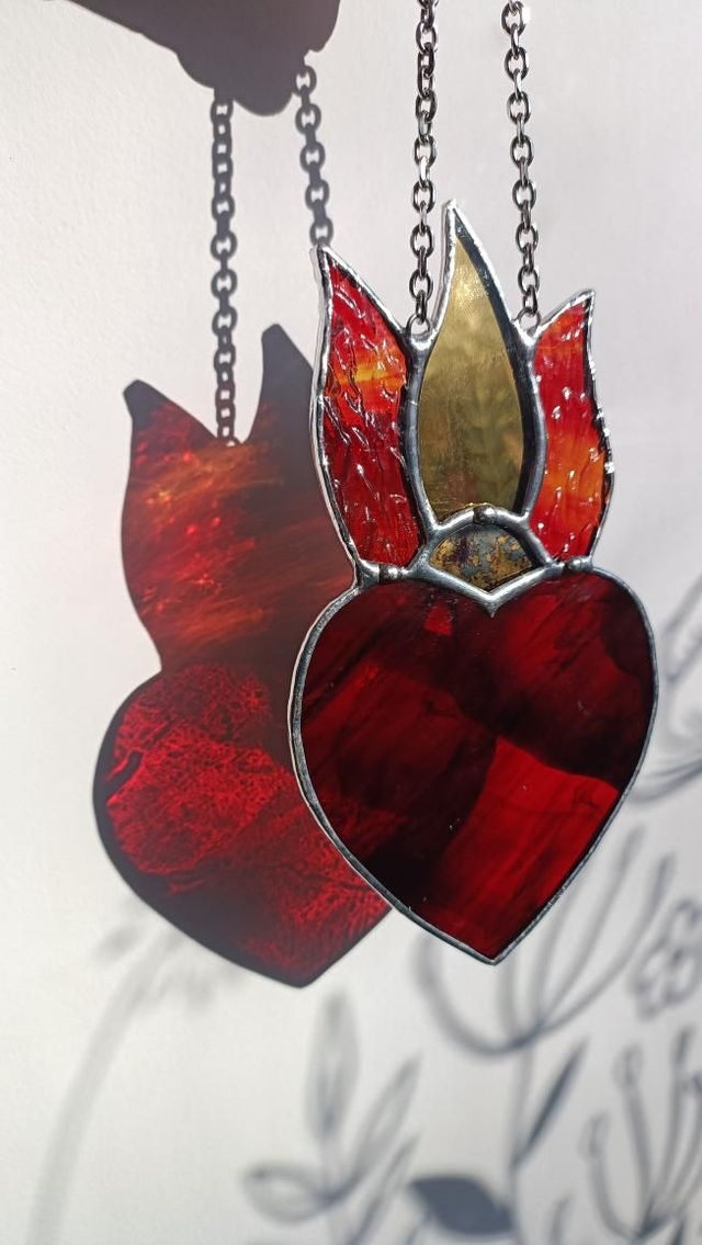 - Cœur rouge fumé noir avec des flammes en verre miroir doré au centre, rouge orange aux reliefs de vague. Au centre une pièce en verre miroir dorée et argenté.