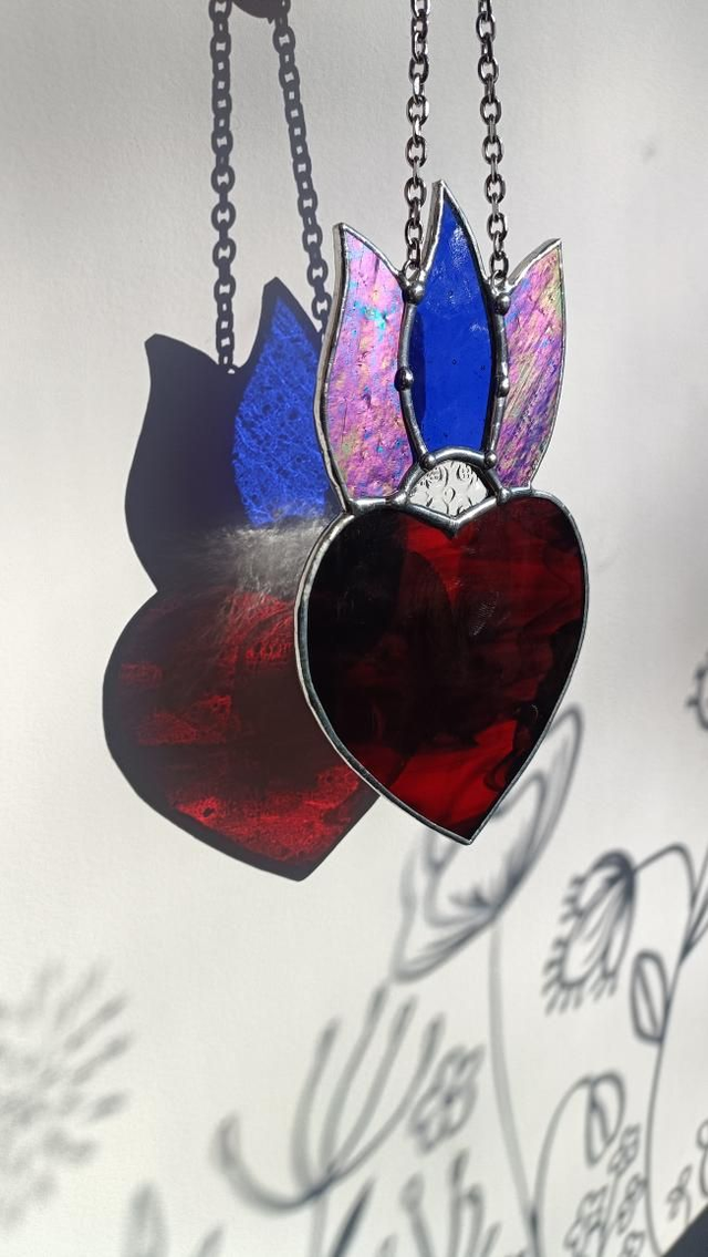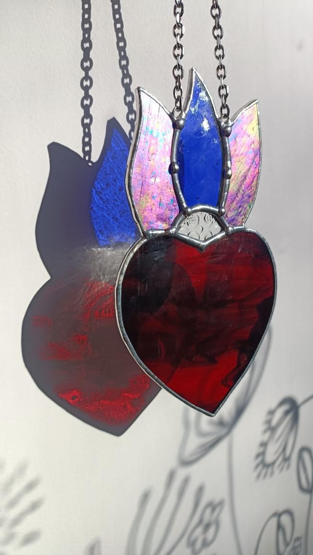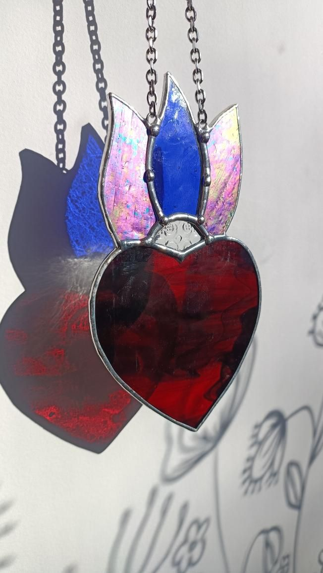 - Cœur rouge fumé noir avec des flammes bleu cobalt transparent au centre, bleu opaque irisé. Au centre une pièce transparente aux reliefs d'arabesques.