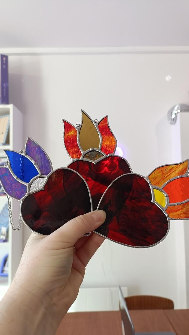 - Cœur rouge fumé noir avec des flammes en verre orange fluo au centre, rouge orangé sur les côtés. Au centre une pièce en verre jaune citron.